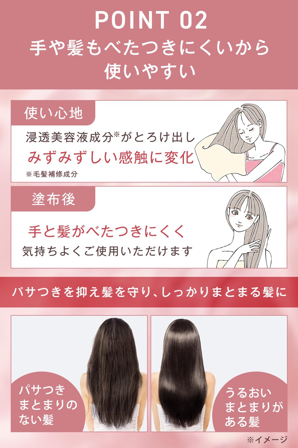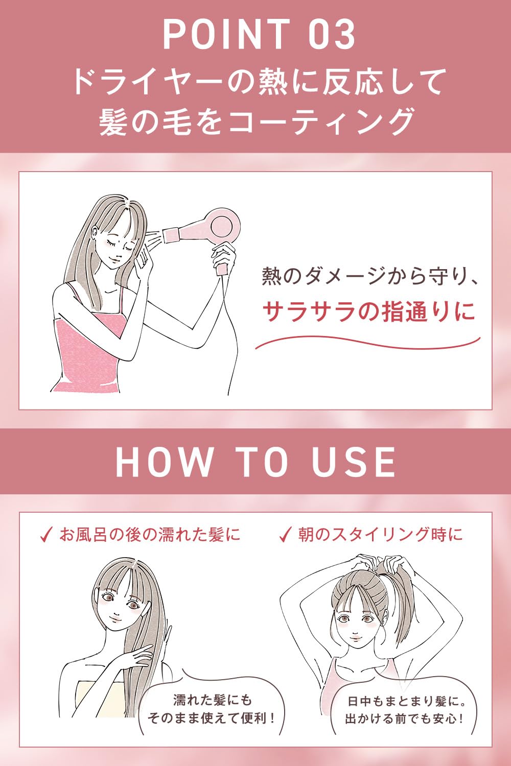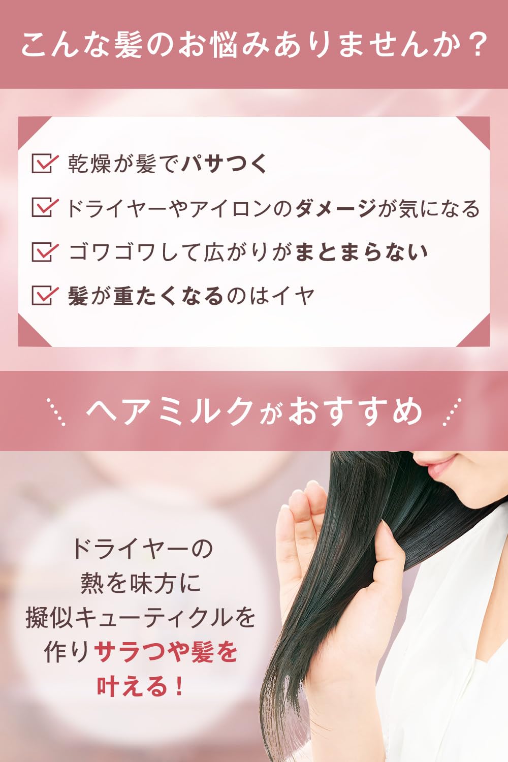 - It's easy to use. Take an appropriate amount and apply to towel-dried hair (or dry hair), focusing on the ends. Using the heat of the hair dryer, it creates pseudo cuticles, making hair smooth and silky to the touch. In addition, the highly moisturizing milk coats the surface of the hair to prevent moisture from escaping. With thorough care from both inside and outside, your hair will stay moisturized and healthy.