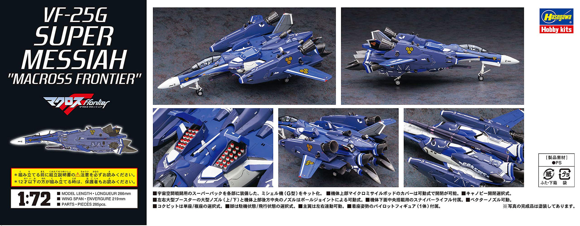 Details: Hasegawa HAS-65831 Macross Frontier 1/72 VF-25G Super Messiah Hasegawa presentation of a 1/72 scale VF-25 Super Messiah from “Macross Frontier” Series. The model of Michelle aircraft is equipped with super pack for space combat, and armed with a sniper rifle. The model comes with a “G type” head. The cover of the upper fuselage micro-missiles pod is movable and can be position freely in opened and closed mode. Optional selection of legs in parking and flight status. The package illustration is by Hideki Tenjin. Model kit requires assembly. Glue and Paint not included.