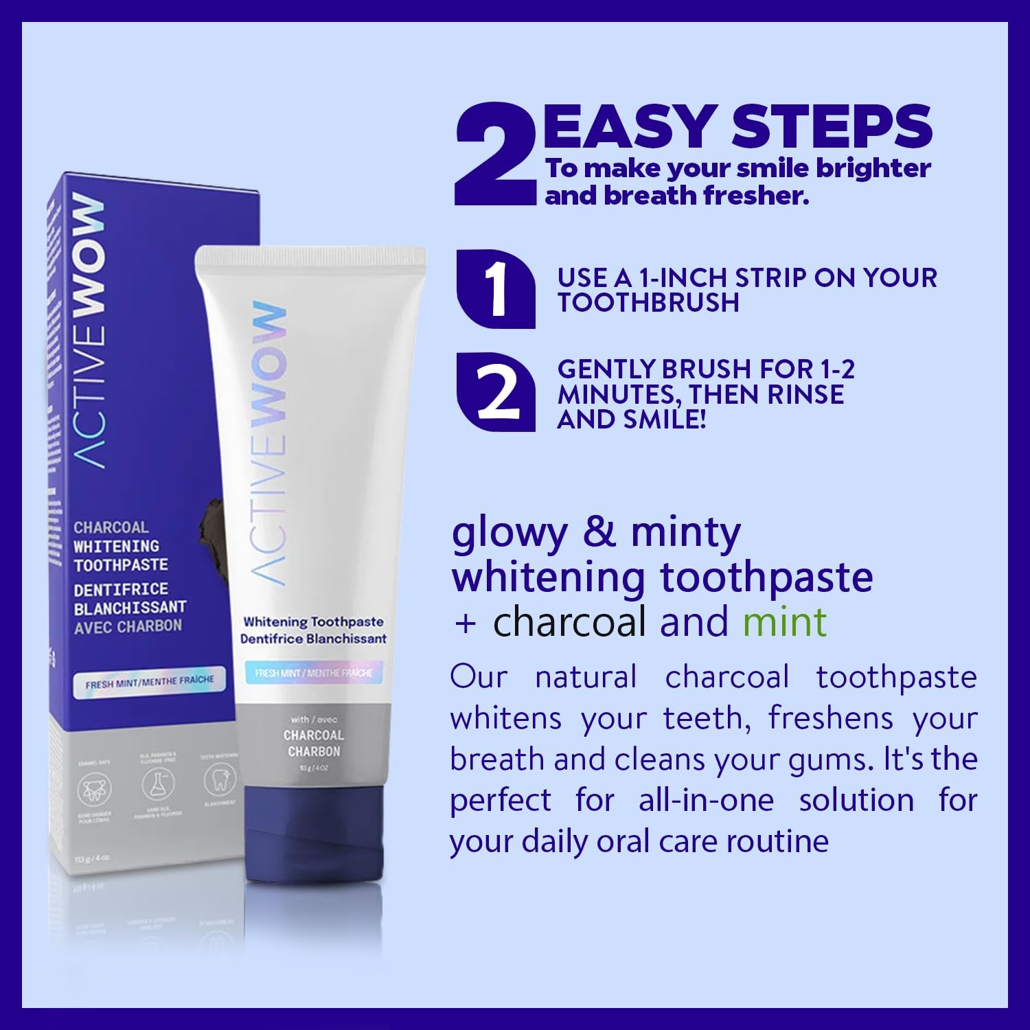 Active Wow Activated Charcoal Toothpaste - Charcoal Toothpaste for Whitening, Charcoal Teeth Whitening, Made with Organic Coconut Oil & Xylitol, Charcoal Activated Toothpaste (4 Ounce (Pack of 1))