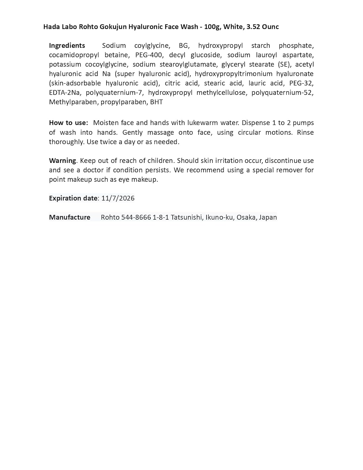 Hada Labo Rohto Gokujun Hyaluronic Face Wash - 100g, White, 3.52 Ounce (Pack of 1)