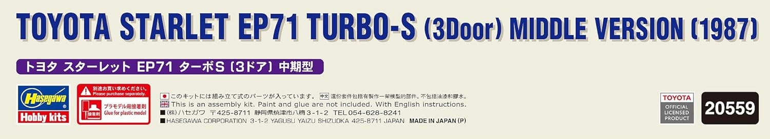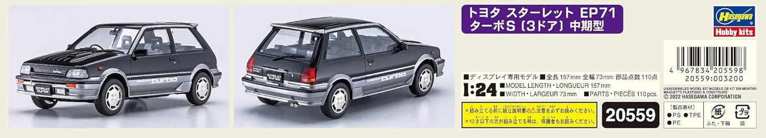 Hasegawa 20559 1/24 Toyota Starlet EP71 Turbo S (3-Door), Mid-Term Model, Plastic Model