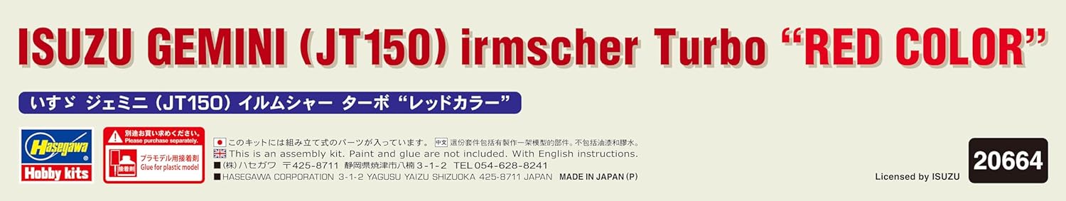 Hasegawa 20664 1/24 Isuzu Gemini (JT150) Irmshire Turbo Red Color Plastic Model