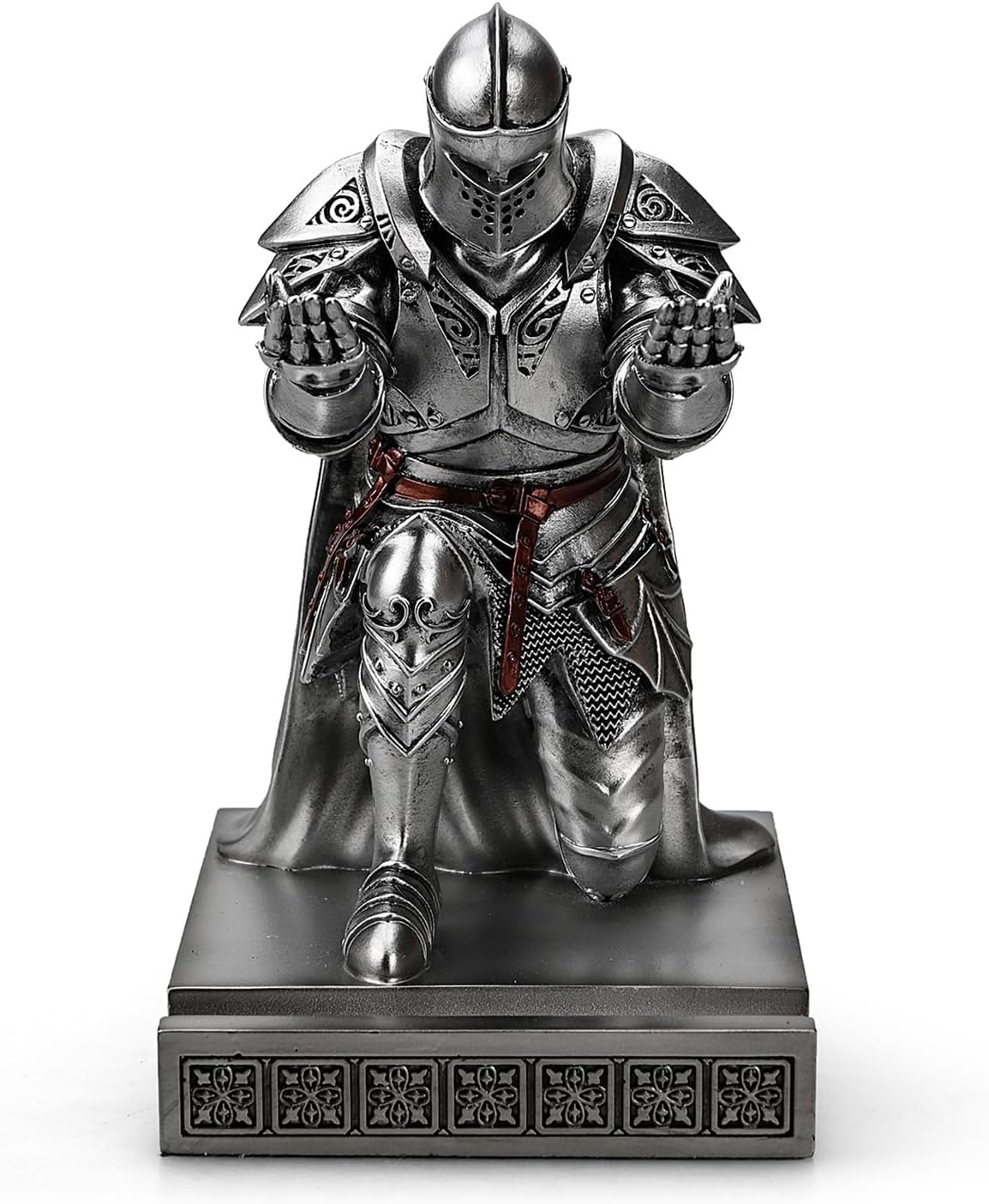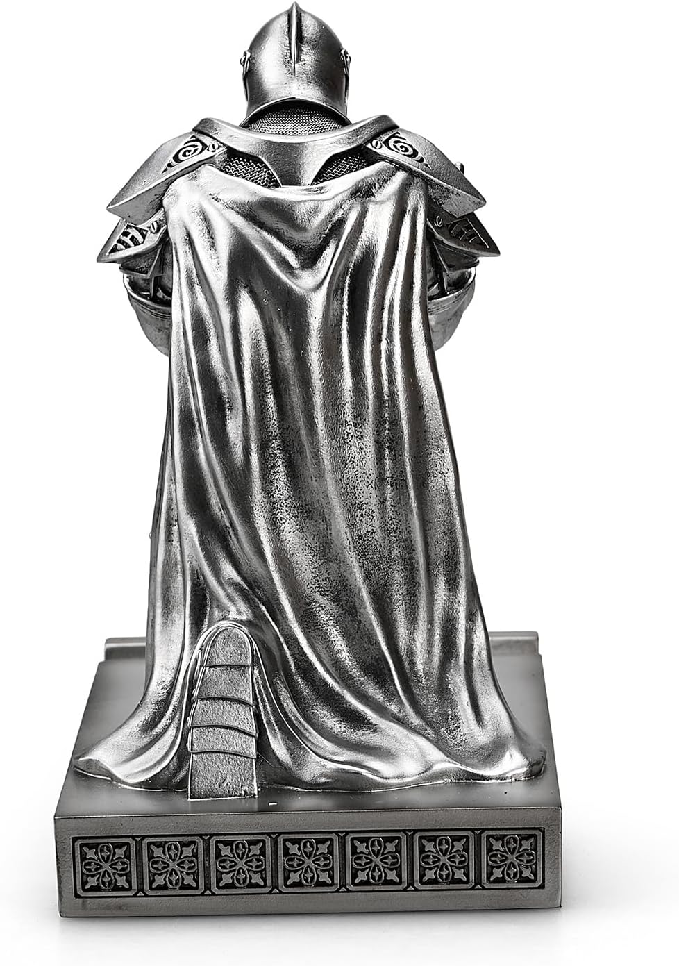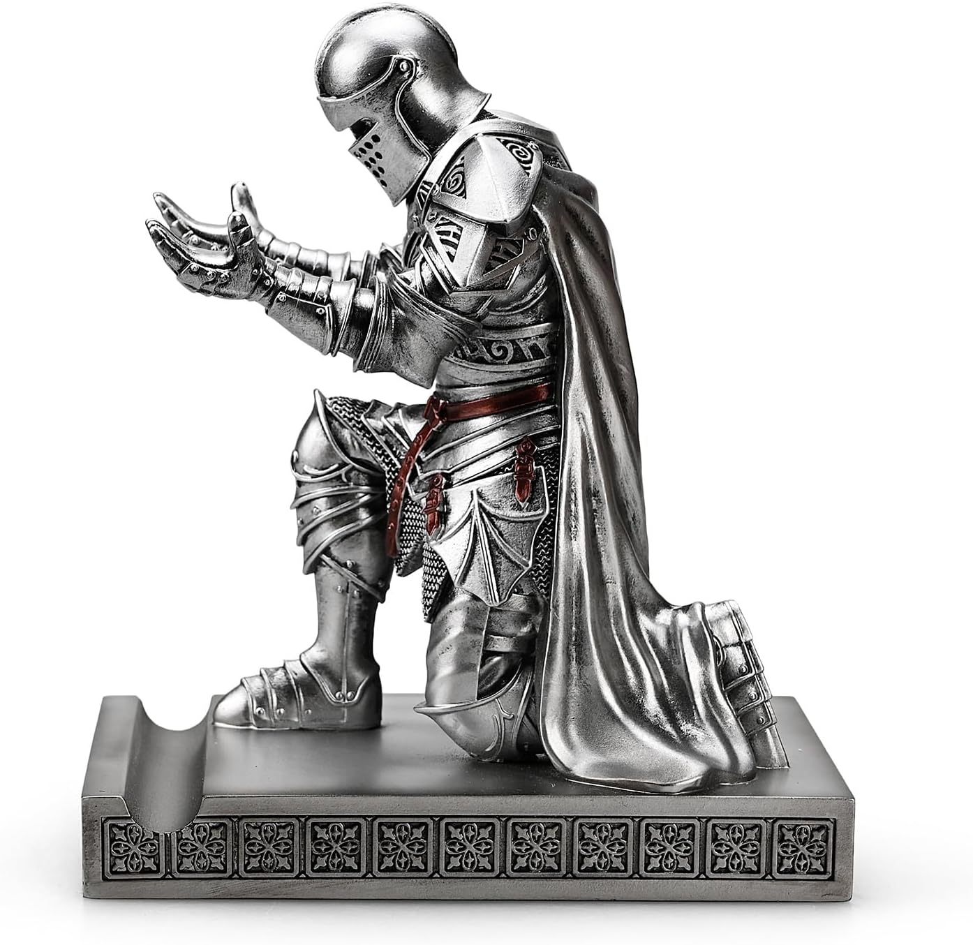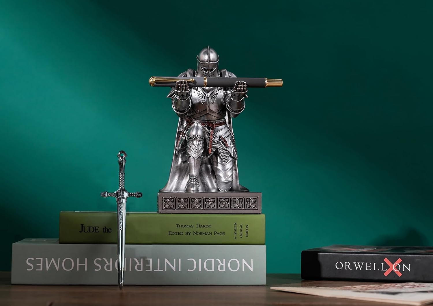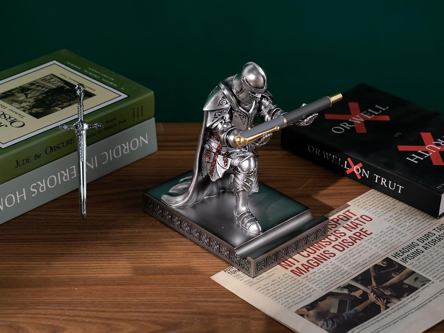 HDMbigmi King's Guard Leader Cloak Warrior Knight Pen Holder Mobile Phone Stand, Ornament Knight Statue, Pen Stand Paperweight with a Metal Sword Letter Opener for Office and Home (Silver)