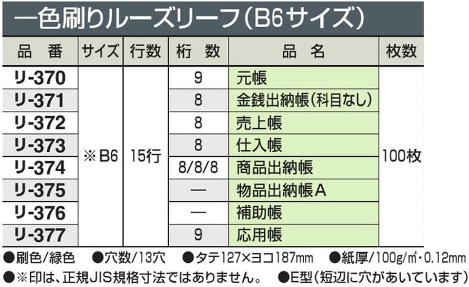 Kokuyo Single Color Loose Leaf B6 Ledger 13 Holes Li-370Z