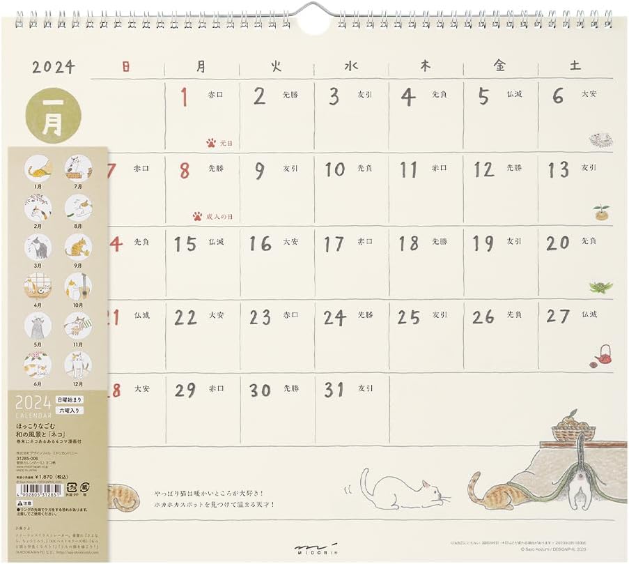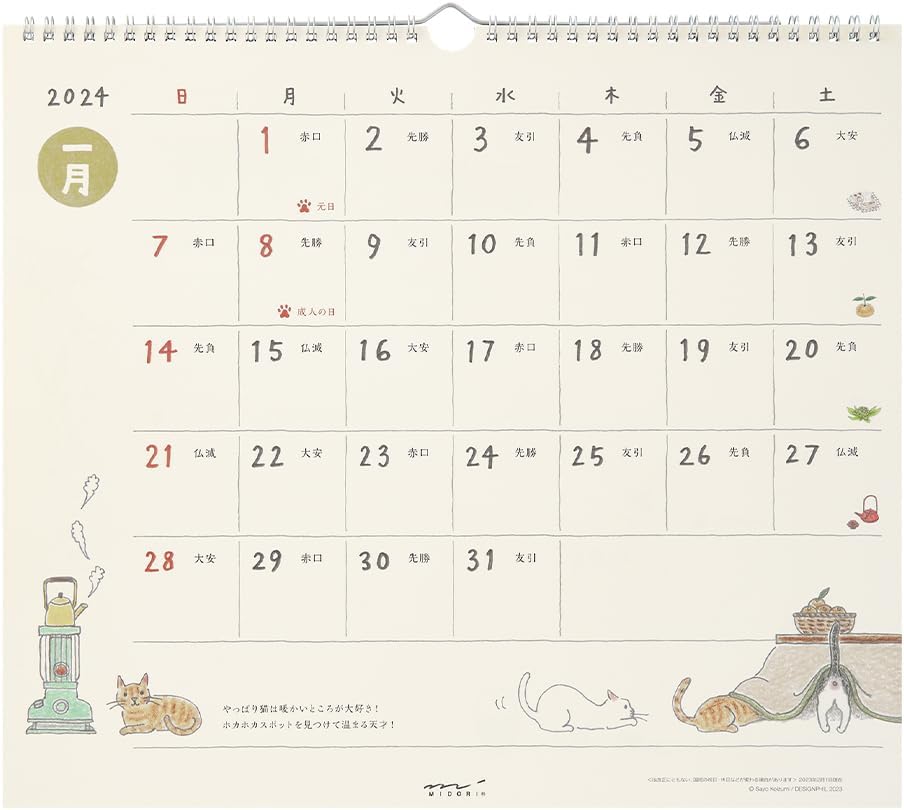 Midori 31287006 2024 Wall Calendar, Large, Country Time Floral Pattern (Cat Print)