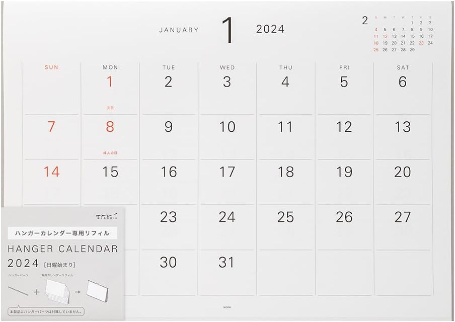 Midori 31295006 2024 Wall Calendar, Hanger Calendar, Refill, White (white)
