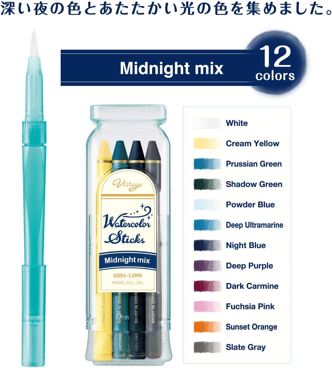 Pentel GSS1-12MN Whole Lead Colored Pencil, Watercolor Stick, 12 Colors, Midnight Mix