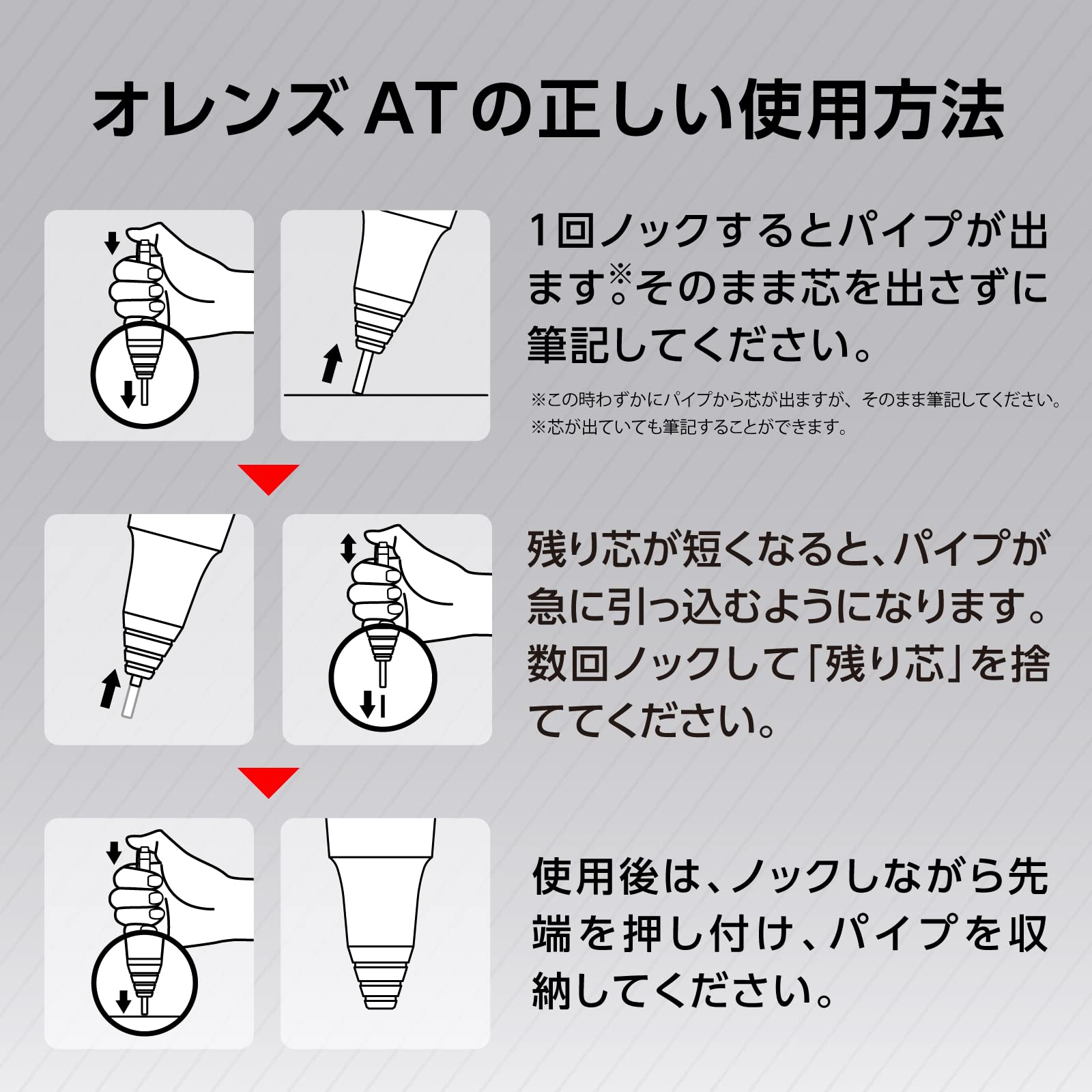 Details: Introducing a new model of Orenz that features an automatic lead advance mechanism that lets you keep writing with just one knock, and a dual metallic grip that allows for a firm grip, allowing you to think more without losing concentration than ever before.