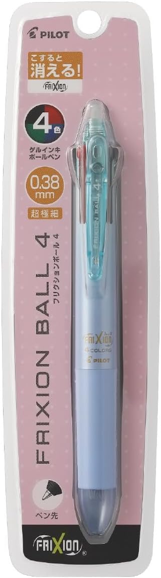 PILOT Ballpoint Pen, Frixion Ball 4, 0.38mm Ultra Fine, 4 Colors (Black, Red, Blue and Green), Gradation Light Blue Body (PLKFB80UF-GRLB)