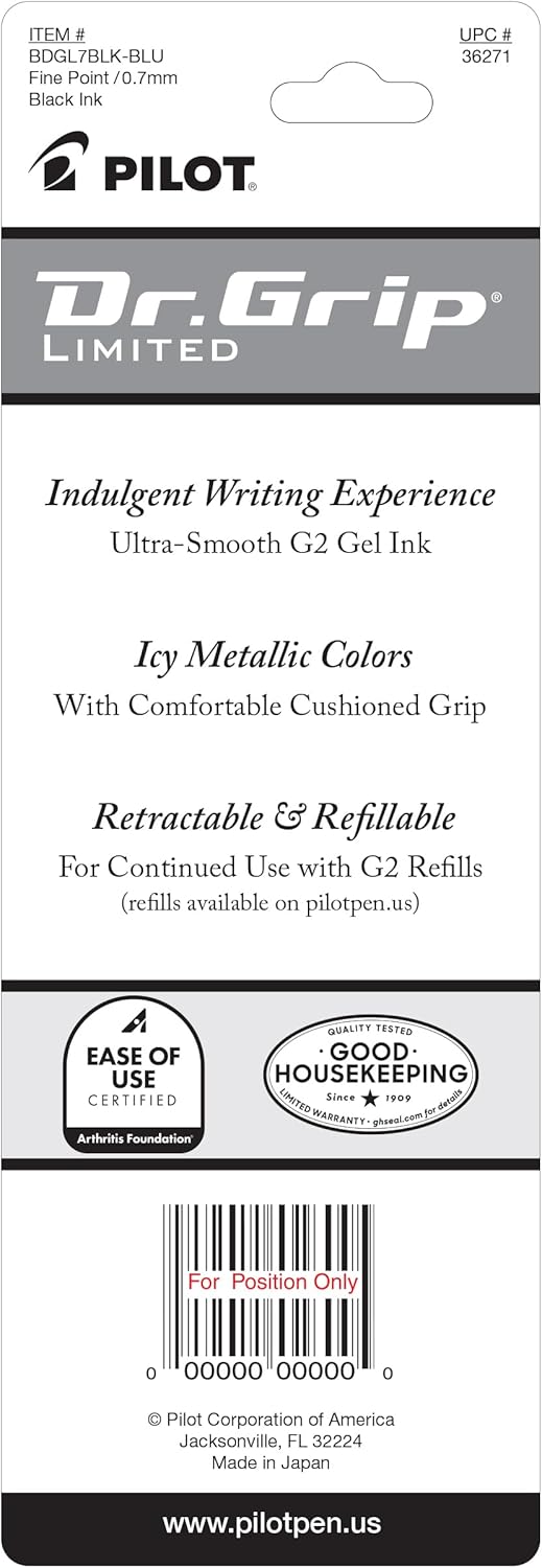 PILOT Dr. Grip Limited Refillable & Retractable Gel Ink Rolling Ball Pen, Fine Point, Metallic Ice Blue Barrel, Black Ink, Single Pen (36271)