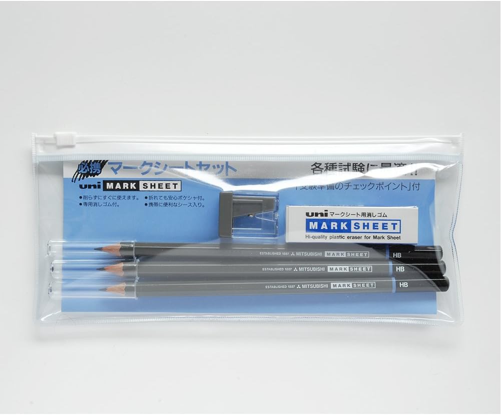 Set Contents: Marksheet pencils, hexagonal shaft, 3 HBs, with tip sharpening and cap, eraser for mark sheet, pocket sharpener, checkpoint for exam preparation.