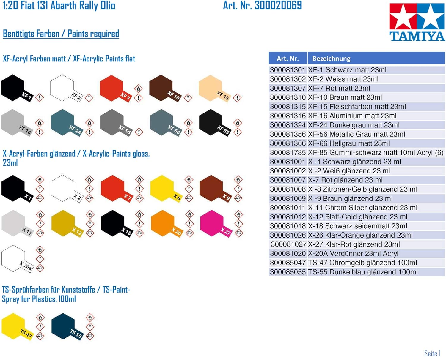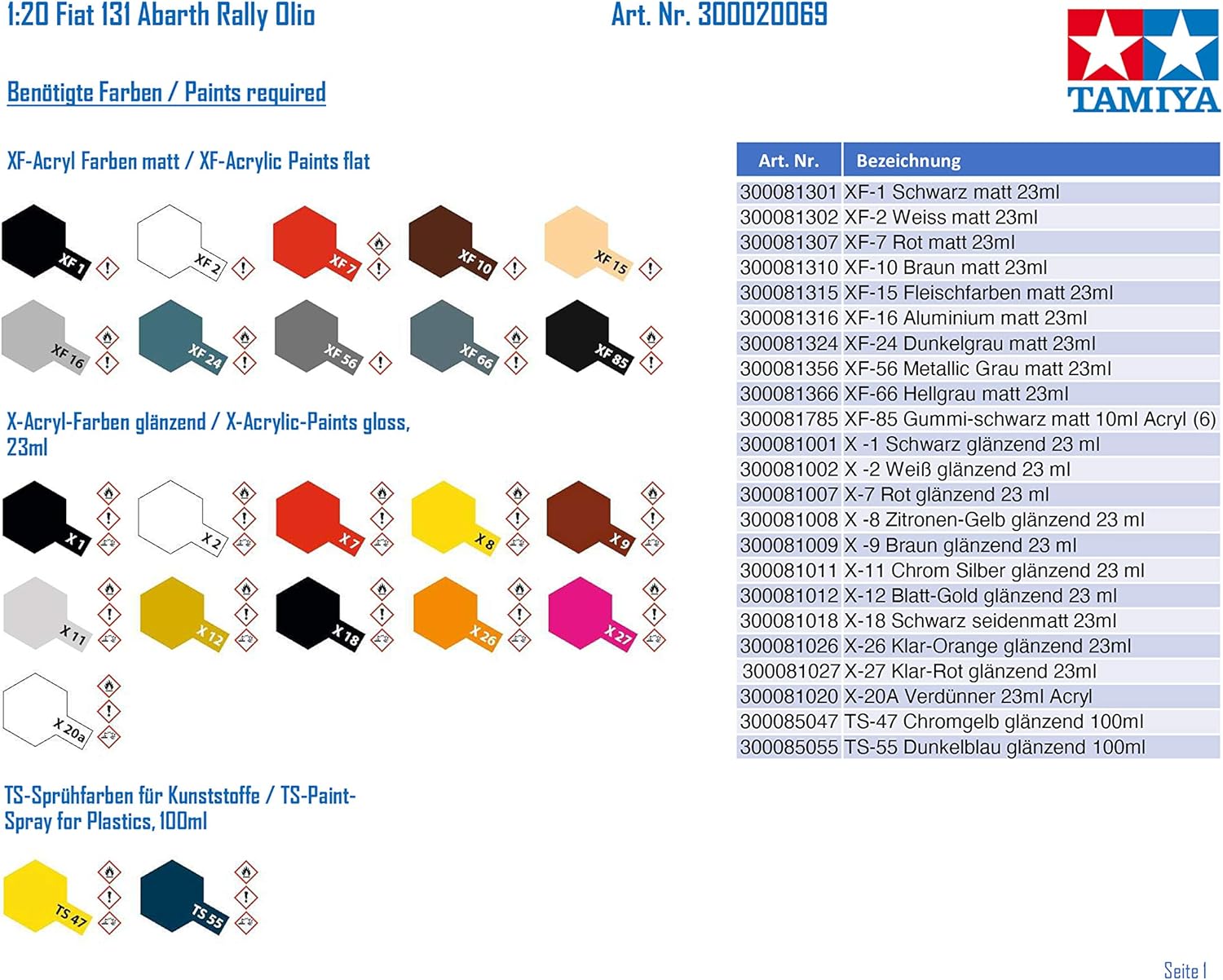 Tamiya 20069-000 300020069 Fiat Vehicle 1:20 131 Abarth Rally Olio, Faithful Replica, Making, Plastic, Crafts, Hobby, Gluing, Model kit, Assembly, unpainted, Blue/Yellow, Mittel
