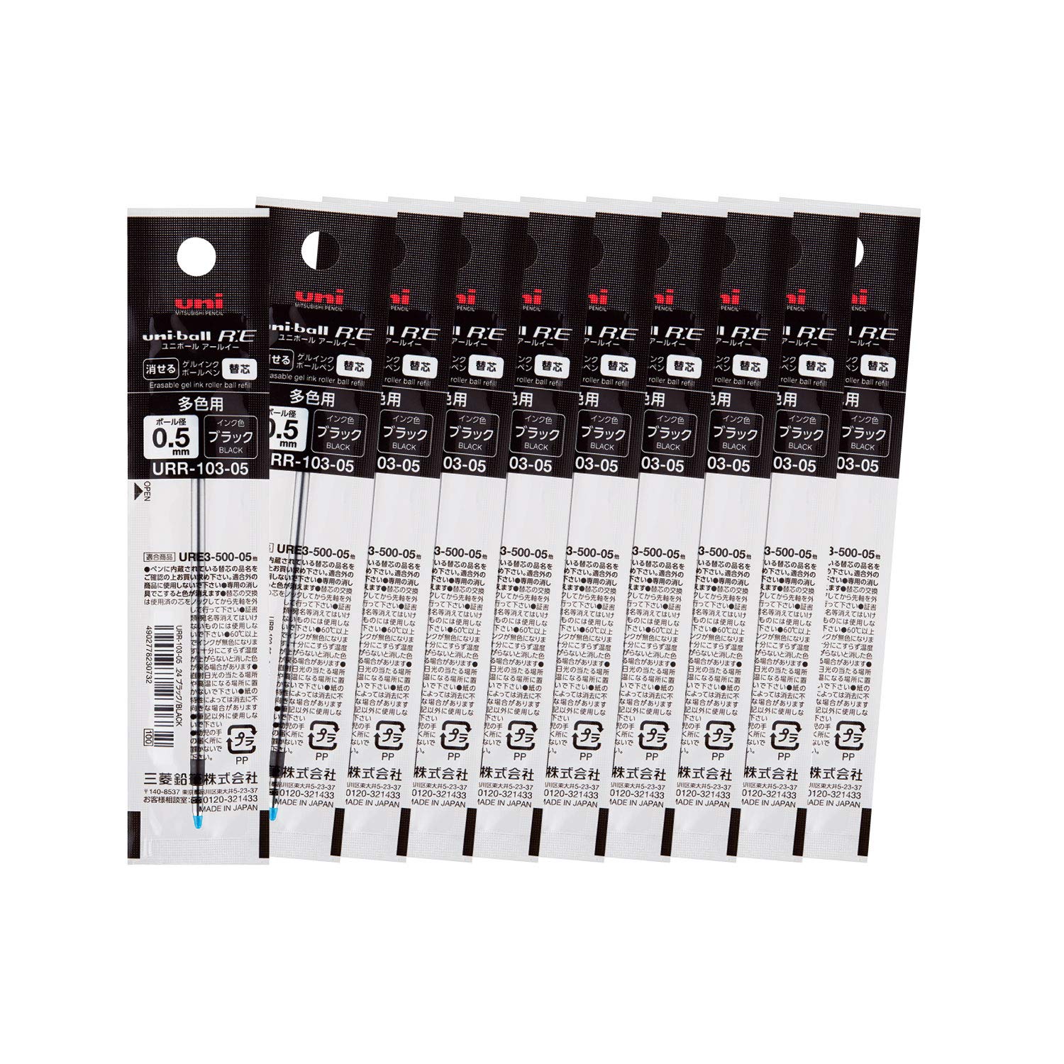 Mitsubishi Pencil Uni-ball RE3 Erasable 3-Color Ballpoint Pen Refill, 0.5mm, Black, Pack of 10 (URR10305.24)