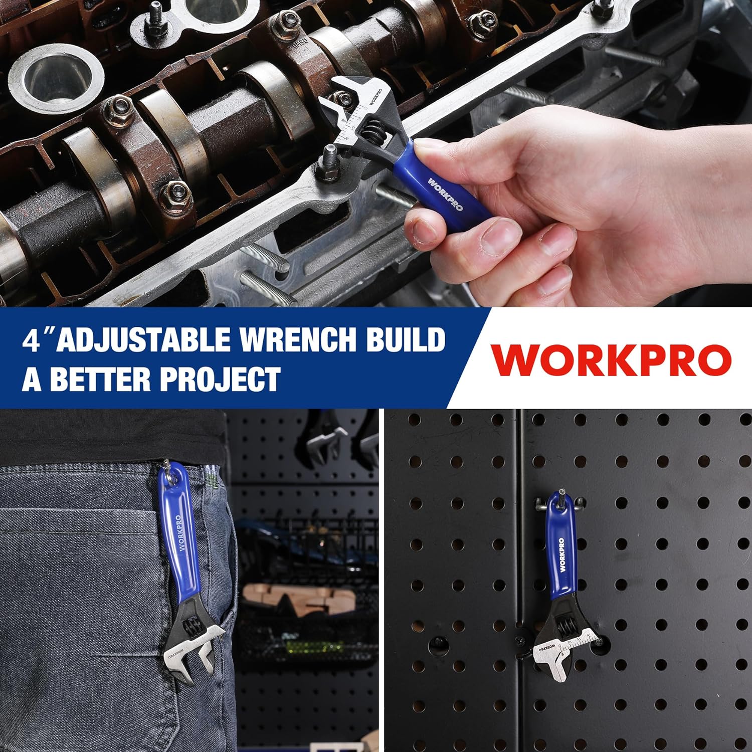 WORKPRO 4-Inch Adjustable Wrench, Cr-V Steel Wrench, Wide Jaw Black Oxide Wrench, Metric & SAE Scales, for Home, Garage, Workshop and DIY
