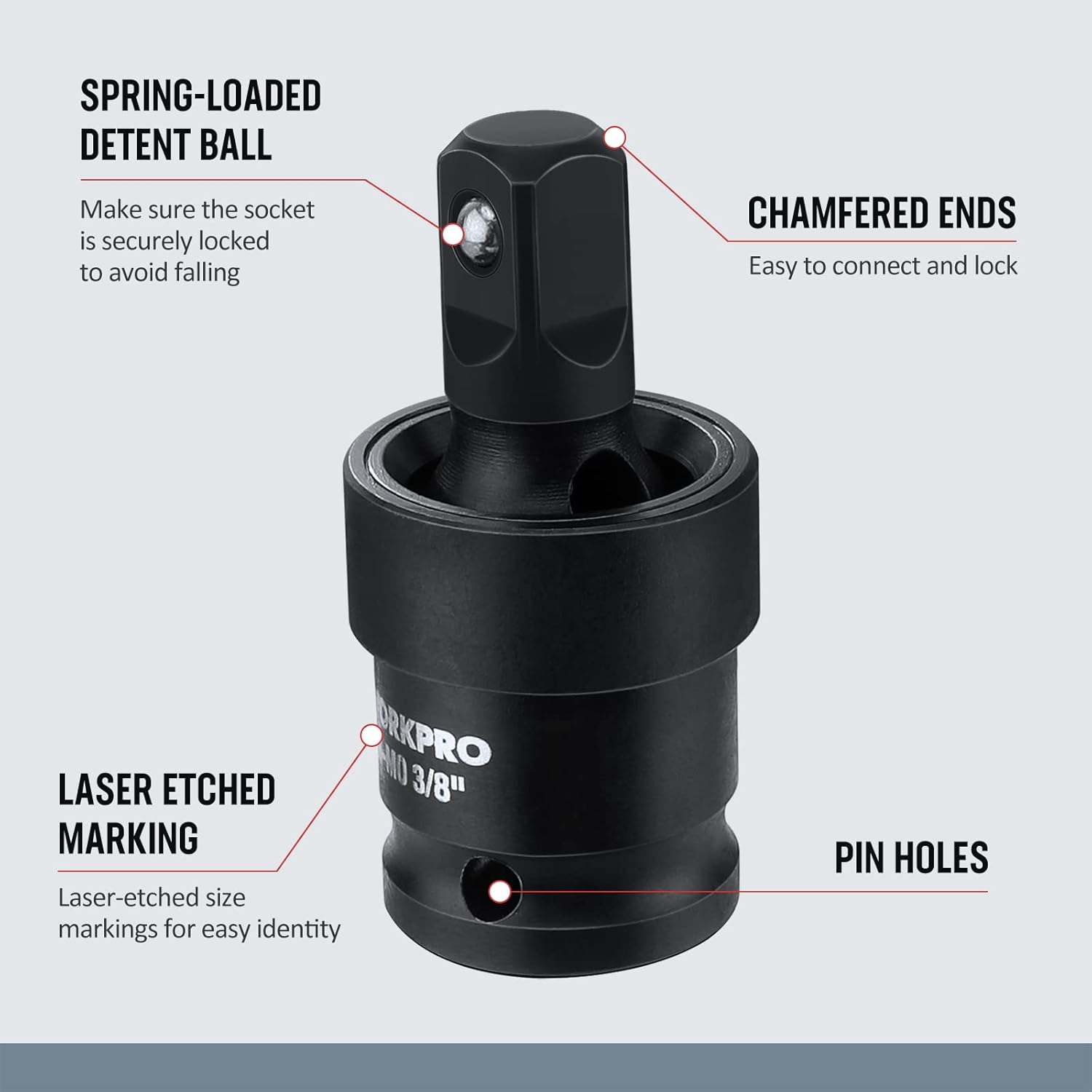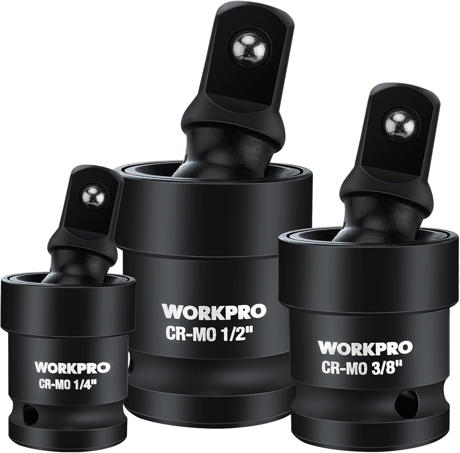 WORKPRO Impact Universal Joint Set, 3 Piece-1/2", 3/8", 1/4"Inch Drive Swivel Socket Set, Socket Adapter Set, Premium CR-MO Steel, Impact Grade, 360 Degree Rotation for Various Angles