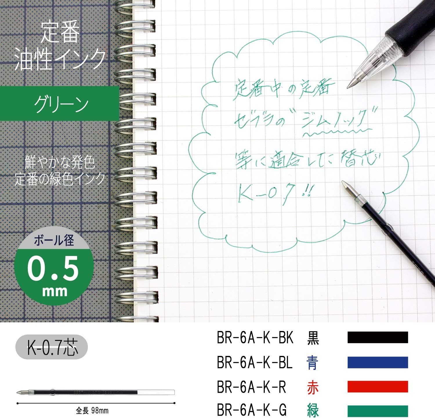 ZEBRA B-BR-6A-K-G Oil-Based Ballpoint Pen Refill, Gymknock, K-0.7 Lead, Green, 10 Pens