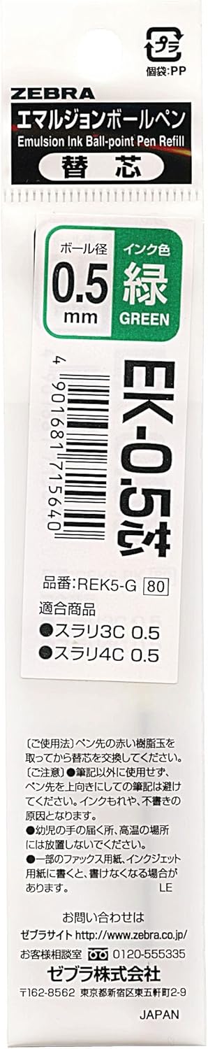 ZEBRA Ball Point Pen Refill for Surari Multi Ball Point Pen and Multi Function Pen Green Ink, 0.5mm Point (REK5-G)