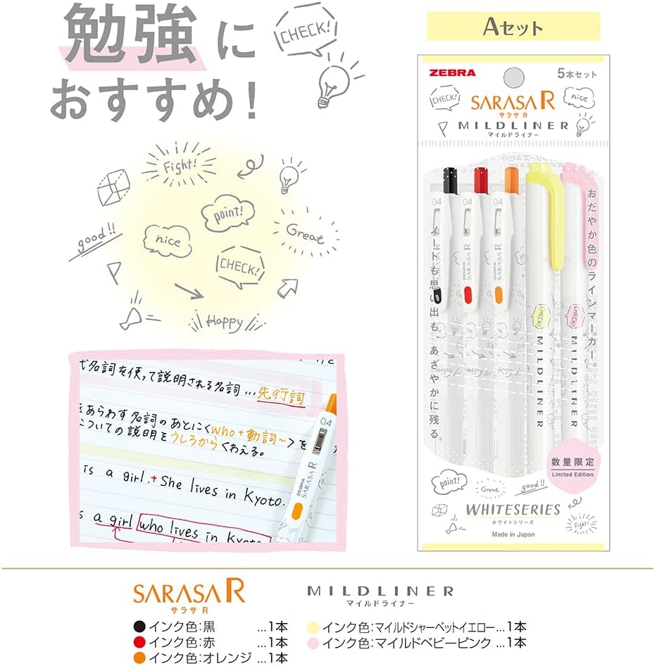 ZEBRA P-JJS29-R1W-A Sarasa R & Mild Liner Gel Ballpoint Pen, White Series, Set of 5